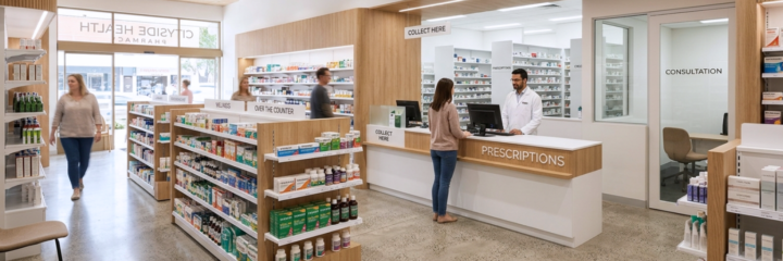 - Category zoning that creates a logical patient journey from front-of-store impulse categories through to health and wellness zones positioned closer to the dispensary counter