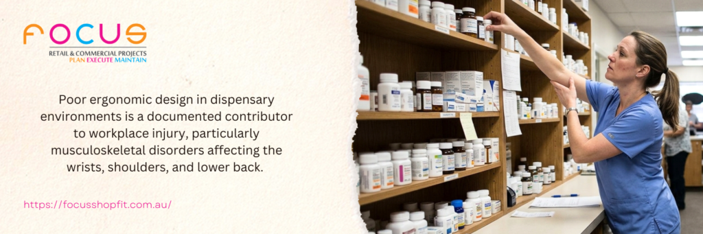 The dispensary is the operational core of any pharmacy. Its layout directly affects script throughput, dispensing accuracy, and staff fatigue levels across a full trading day. Poor ergonomic design in dispensary environments is a documented contributor to workplace injury, particularly musculoskeletal disorders affecting the wrists, shoulders, and lower back. Safe Work Australia identifies workstation design as one of the most effective controls for reducing musculoskeletal disorders in high-repetition work environments. An effective dispensary layout accounts for all of the following: