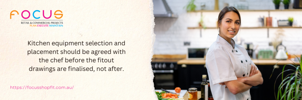 Kitchen equipment selection and placement should be agreed with the chef before the fitout drawings are finalised, not after. The equipment layout determines the entire production flow, and changes to equipment placement after construction has begun are among the most expensive variations in hospitality fitout work.