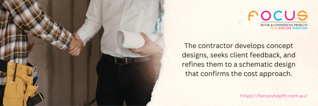 The client provides a brief covering the scope of works, any fixed requirements such as brand standards or landlord fitout guidelines, the budget range, and the required programme. The contractor develops concept designs, seeks client feedback, and refines them to a schematic design that confirms the cost approach.